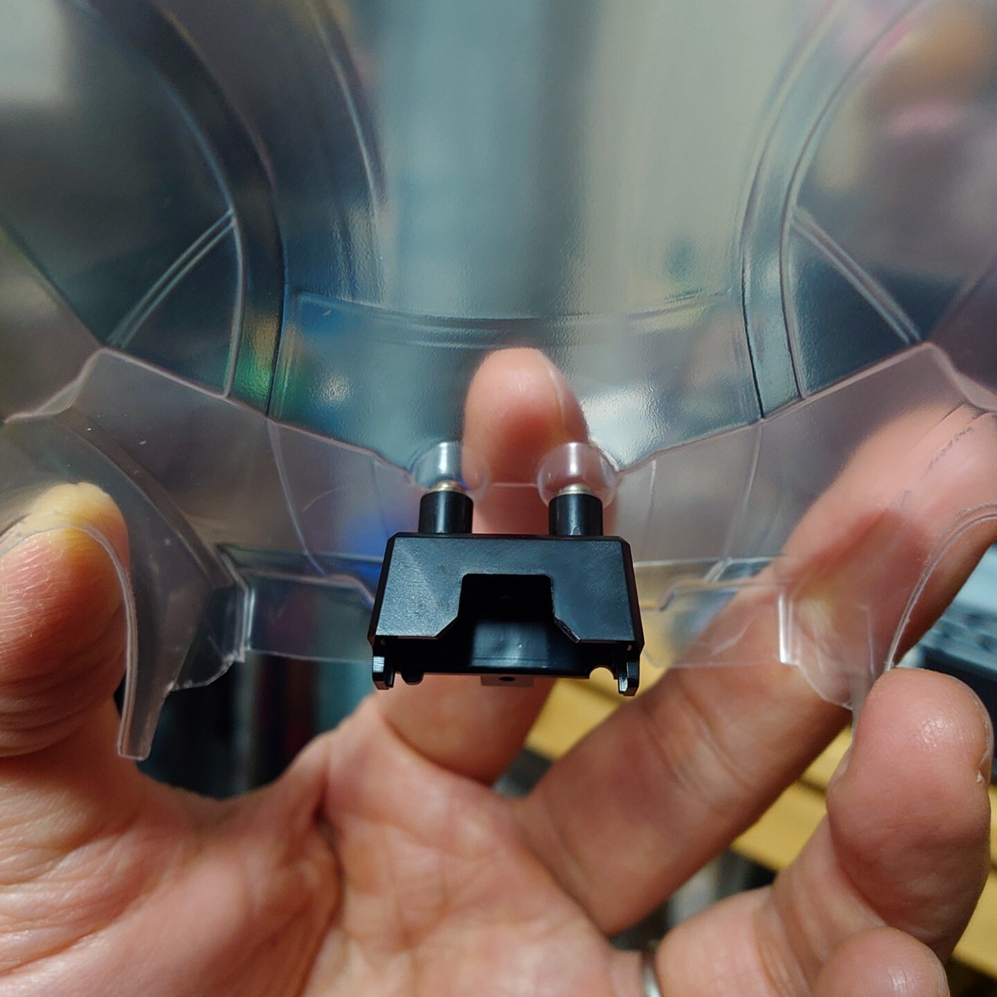 MA用のクリヤーボディをMEに載せるときは、こんな感じで少しだけリヤ側のパーツを加工しないとギヤカバーと干渉するっス
